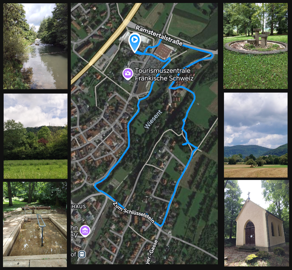 Dieser kurze Spaziergang startet direkt an der idyllischen Wiesent. Du folgst dem Flusslauf und genießt die ruhige Atmosphäre. Entlang des Weges findest du zahlreiche Sitzmöglichkeiten, die zu kleinen Pausen mit Blick aufs Wasser einladen.